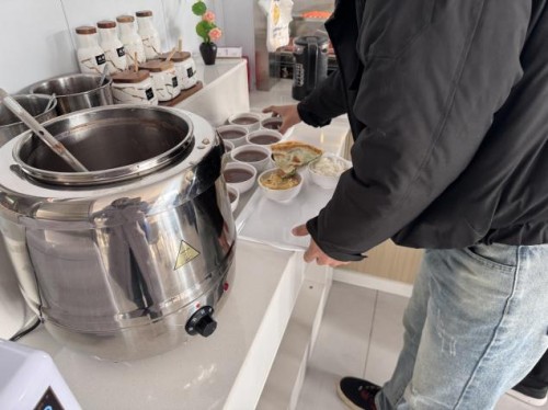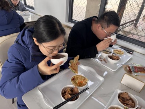 中午时分,食堂窗口前排起长队。红枣、红豆、花生米、莲子、糯米等十余种食材经过数小时熬煮,化作一碗碗热气腾腾的腊八粥迎接员工的到来。厨师们将腊八粥盛到每位员工碗中,员工们接过粥碗,笑容洋溢。